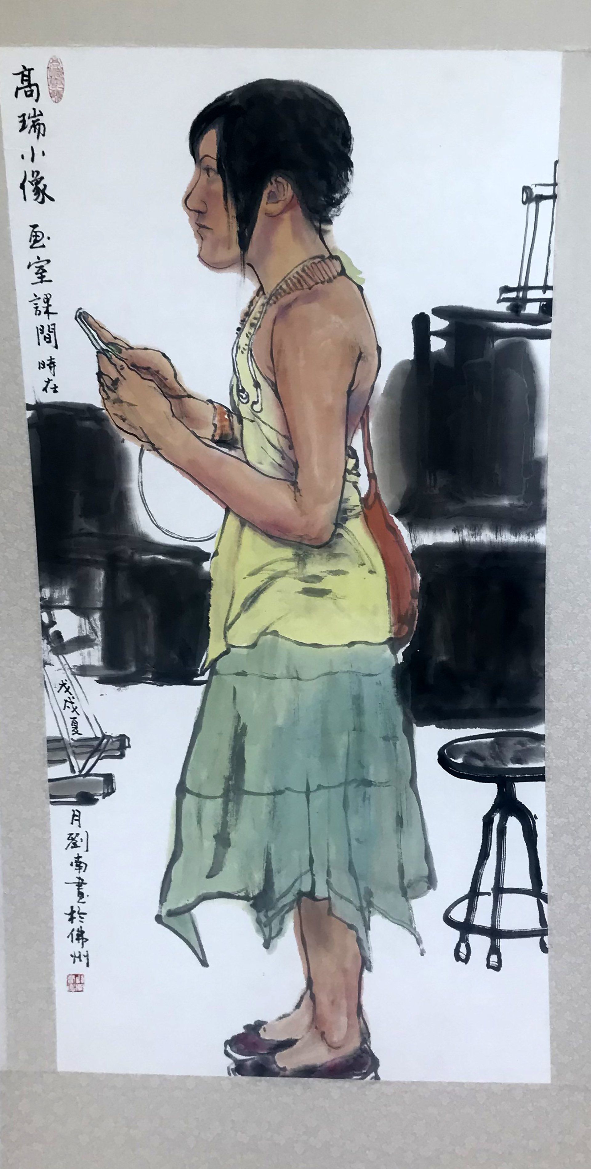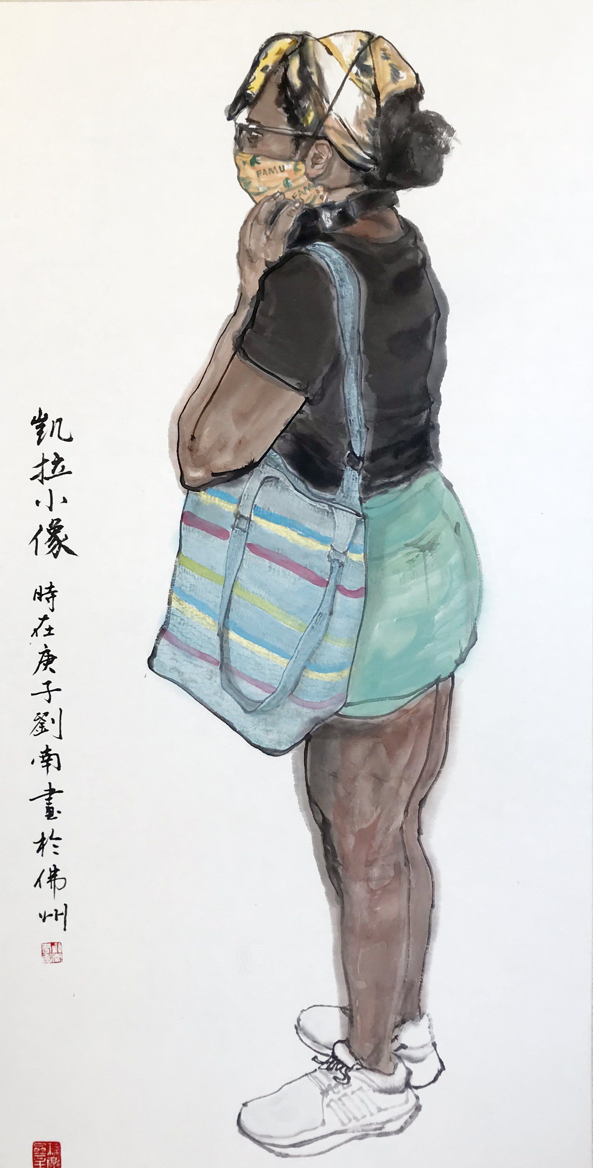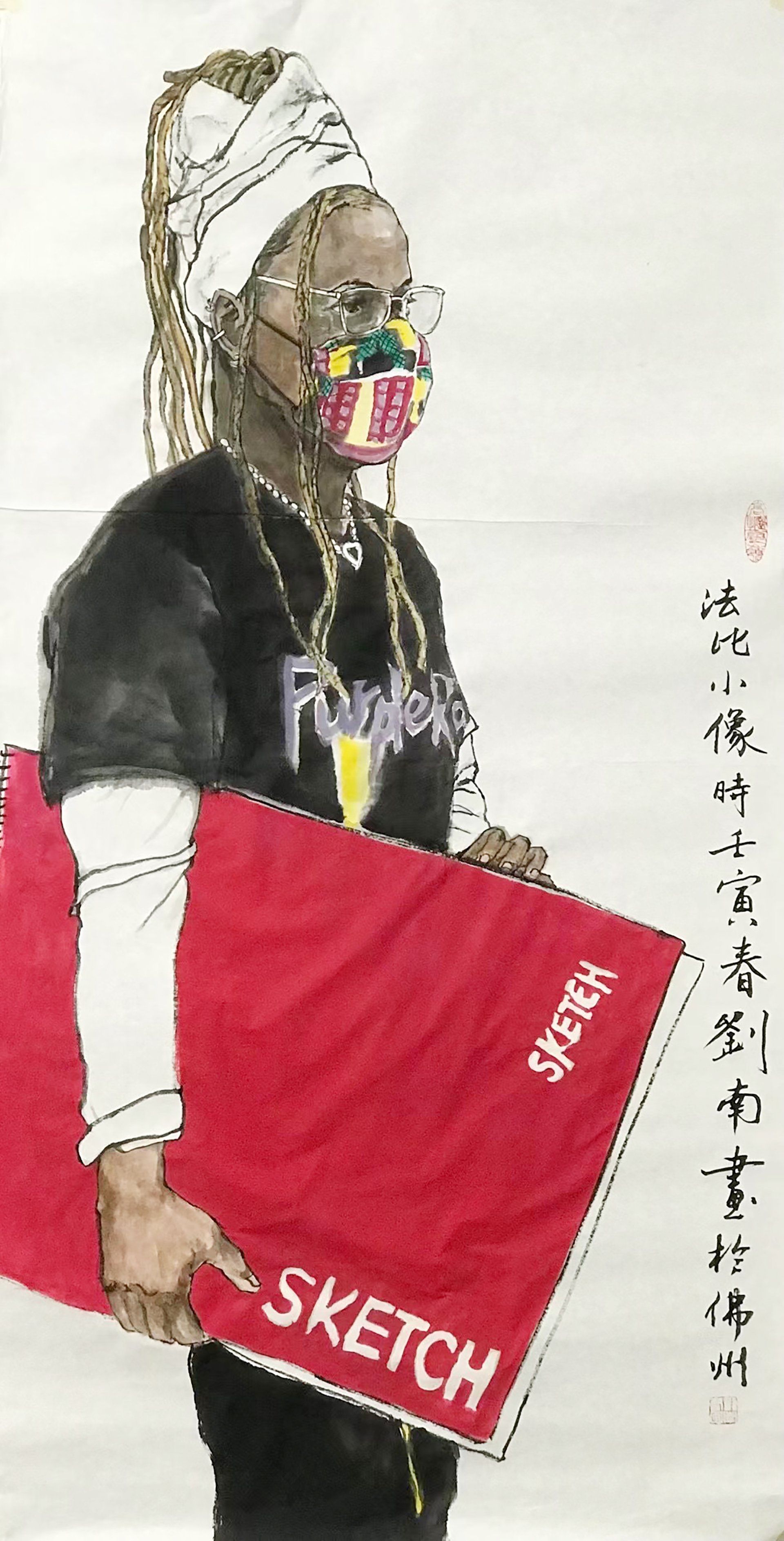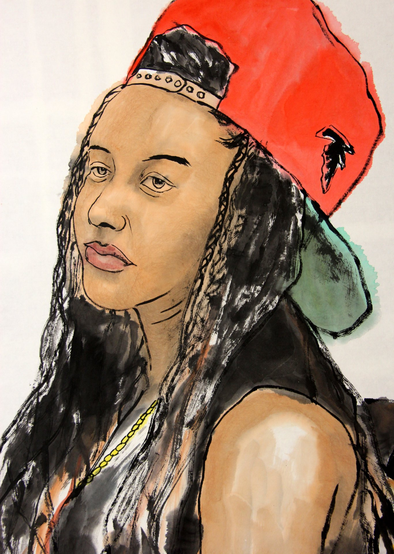 ButtonIdrianna with Scarf, Ink and Color on Xuan Paper, 27x54 inches, 2025