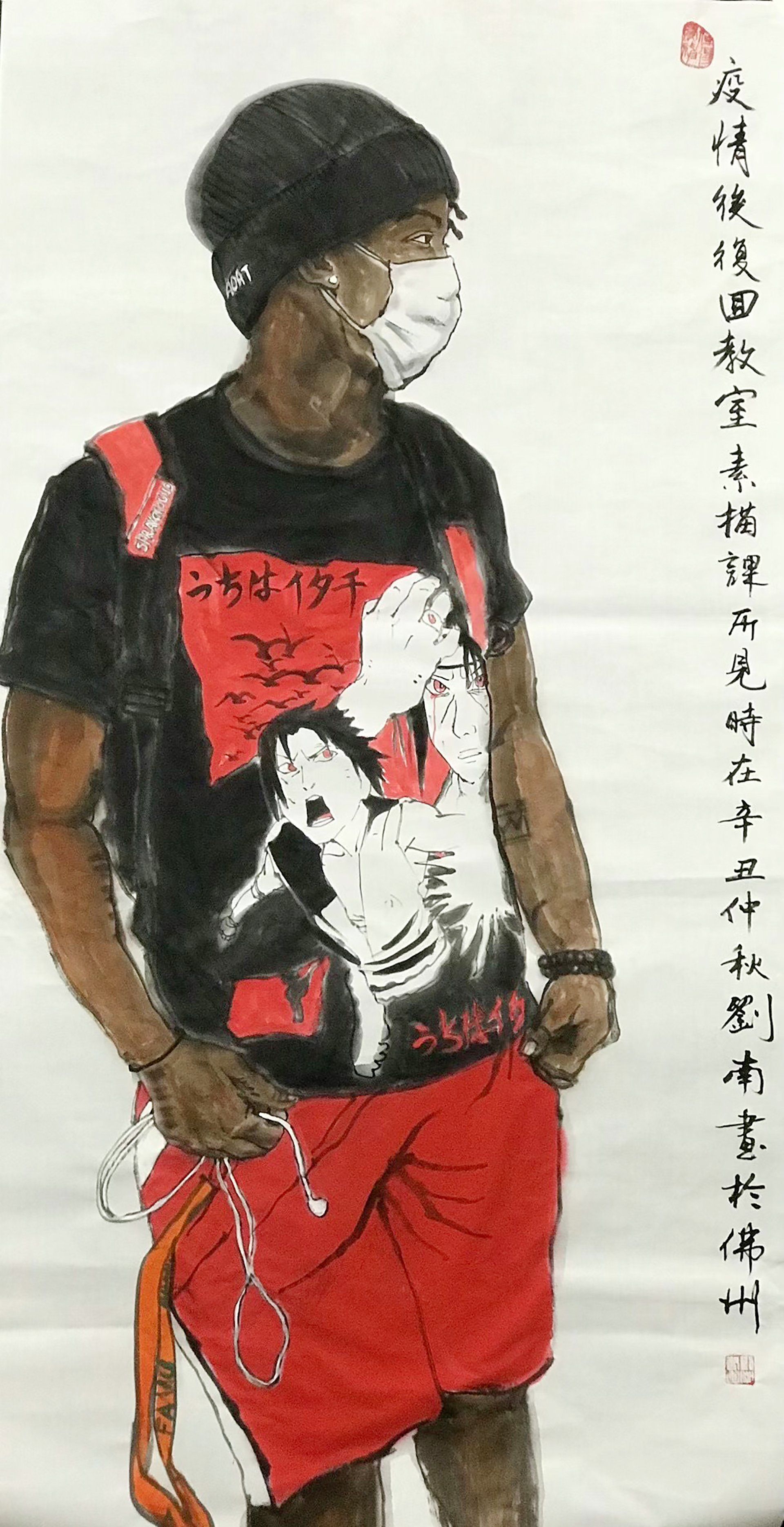 ButtonDenzel, Ink and Color on Xuan Paper, 27x54", 2021